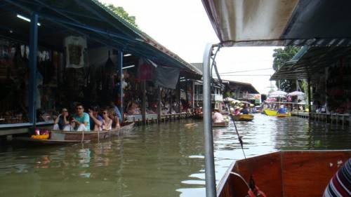 Путешествие началось с музейного тайского дома, где посмотрели как обустраивают свое жилье тайцы. Затем прогулка по каналам на длиннохвостых лодках с посещением плавучего рынка, население которого живет на воде. В королевском центре резьбы по тиковой древесине увидели шедевры резьбы по дереву местных мастеров. Там можно было приобрести из тикового дерева любую мебель, причем с доставкой по России. Вечером нас привезли в отель на воде, где накормили ужином, сделали часовой массаж всего тела (300 бат), очень своеобразный, ни с каким другим массажем не сравнить. На следующий день отправились на радоновые источники (они только открылись после подтопления водой, и вода в них была мутной), затем мы на огромном плоту сплавлялись по реке Квай. Проплыв мимо 2-х водопадов, одели жилеты, и за борт, плот отчалил от нас, а нас река сама несла к месту стоянки нашего плота, было здорово. И после вкусного обеда, мы отправились домой, и путь в 5-6 часов показался незаметным, благодаря положительным эмоциям и нашему гиду, который поставил для нас фильм-комедию. Это самая лучшая экскурсия из всех.