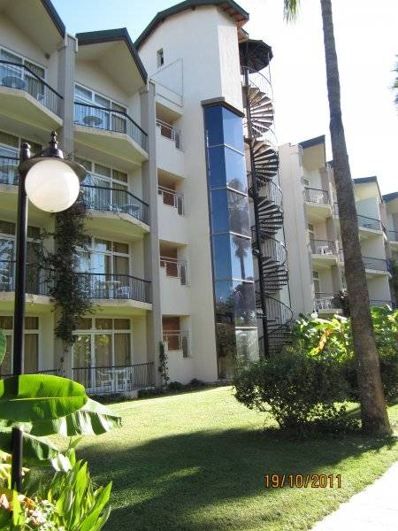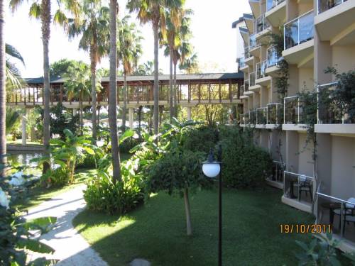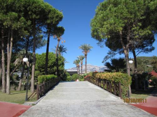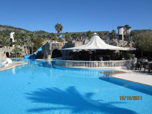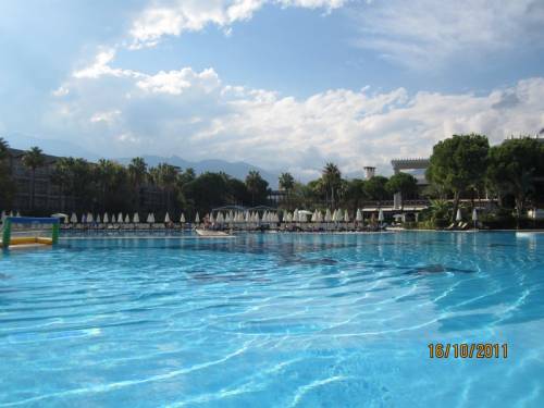 Территория отеля красивая, многочисленная зелень и множество мостиков придавал отелю неповторимый сказочный вид. Вход в море галечный, пляжная зона большая, с множеством шезлонгов. Есть водные горки(3шт.) и огромный просторный бассейн.
