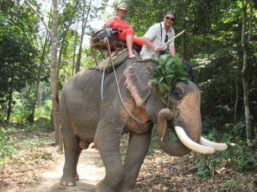 В пределах 30-40 минут ходьбы от отеля находились 3 слоновые фермы. В ближайшей 2-х часовое катание обойдётся 900 бат со взрослого 500 с ребёнка, пройдя дальше еще одна ферма, где аналогичная поездка обойдётся 900 со взрослого, ребёнок 6 лет бесплатно. Добраться можно: пешком, взятым напрокат байком, заказать бесплатный трансфер на ферму из отеля или купив тур у туроператора, при этом переплатив оператору от 300 – 1000 бат. Было всё супер, но с купанием лучше не брать и деньги сэкономите и время. Наибольшее впечатление получили от катания в джунглях. Слон послушный как собака. Погонщик что скажет, то слон и делает. Ходит слон по джунглям и каменистому руслу речки ступая очень осторожно.