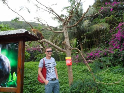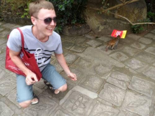 Всем привет! Последнее наше с женой путешествие, было на остров Хайнань. Замечательны климат, природа, обезьянки и если бы там жили тайцы, вместо китайцев, то это было бы излюбленное место отдыха россиян) Если когда-нибудь, доведется там отдыхать, обязательно съездите на остров обезьян. Замечательная экскурсия! Со стикером "Банка горящих туров", решили сфотографироваться именно здесь) Когда супруга делала первую фотографию, манки весело резвились на дереве. У меня в сумке, и карманах были конфетки... Умные обезьянки, это поняли и уже были "на готове", в тот момент меня снимали еще несколько китайцев, супруга испугалась, просила заканчивать с фотосессией, но фото все же получилось)) Затем одной любознательной обезьянке, очень приглянулся стикер "Банк горящих туров", и я решил с ней сфотографироваться) К сожалению, фотик дал сбой, и фотография на которой, мы вместе держимся за стикер испортилась... Остались лишь кульминационные этюды) А вот забрать стикер назад, увы я не решился)) Мораль сей басни, такова: тестируйте фотик по полной, прежде, чем ехать отдыхать)