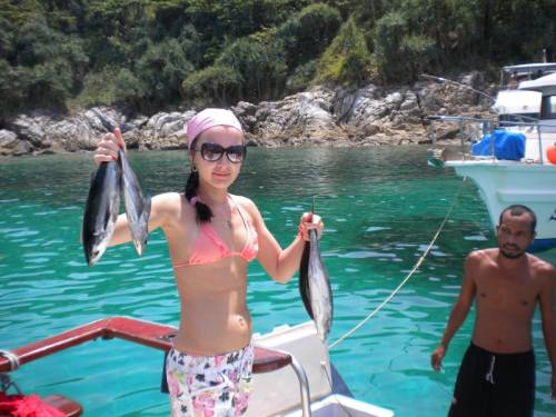 Отель наш расположен в 4-х минутах ходьбы от пляжа Карон - одного из лучших пляжей в мире, по составу песка таких всего 10 на планете, когда идешь, песок хрустит как снег, если резко шоркать ногами по песку - он (песок) начинает свистеть или петь (отсюда название "поющий песок"). Море сказочное - чистое, прозрачное, бирюзовое, теплое! Купались мы утром и вечером каждый день. Но на одном месте сидеть не хотелось, поэтому мы приобрели пару экскурсий: легендарные острова Пхи Пхи - на одном из них Phi Phi Leh снимался культовый в свое время фильм "Пляж" с Ди Каприо в главной роли, место действительно райское, бирюзово-голубая лагуна с идеальным пляжем и множеством тропических рыб; вторая экскурсия - незабываемая и щекочущая нервы морская рыбалка вокруг острова Райя - очень интересное приключение, снорклинг (плавание с маской), купание, загорание на верхней палубе рыбацкого корабля, ну и конечно хороший улов - красавец тунец - и вкуснейший обед из него. До и после морских прогулок мы несколько раз ездили в самые разные уголки острова: торговые центры, ночной тайский рынок, смотровая площадка с дикими обезьянами, змеиная ферма, буддийский храм, сувенирный центр, знаменитая улица Bang La road с кучей баров и дискотек на любой вкус и цвет, на которой вечером одновременно может находиться несколько тысяч человек, конечно же различные интересные шоу, попробовали очень много вкуснейших блюд, фруктов и напитков!